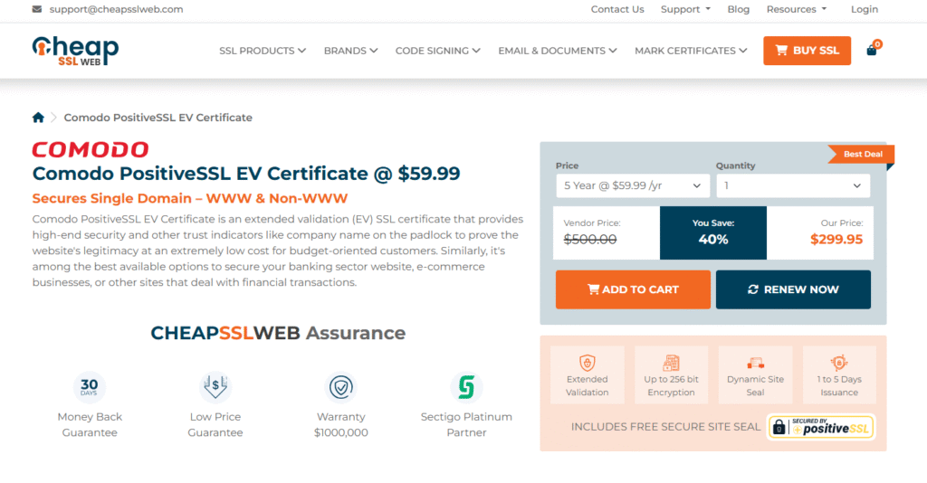 Extended Validation SSLs require the most thorough vetting of businesses. For years, EV SSLs have consistently been the most expensive type of SSL on the market – often costing several hundred dollars a year. CheapSSLWeb dramatically lowers this barrier. For example, their cheapest EV cert for 27% is the Comodo/Sectigo PositiveSSL EV($59.99/year), which is just ridiculously low-priced in the context of normal EV pricing.